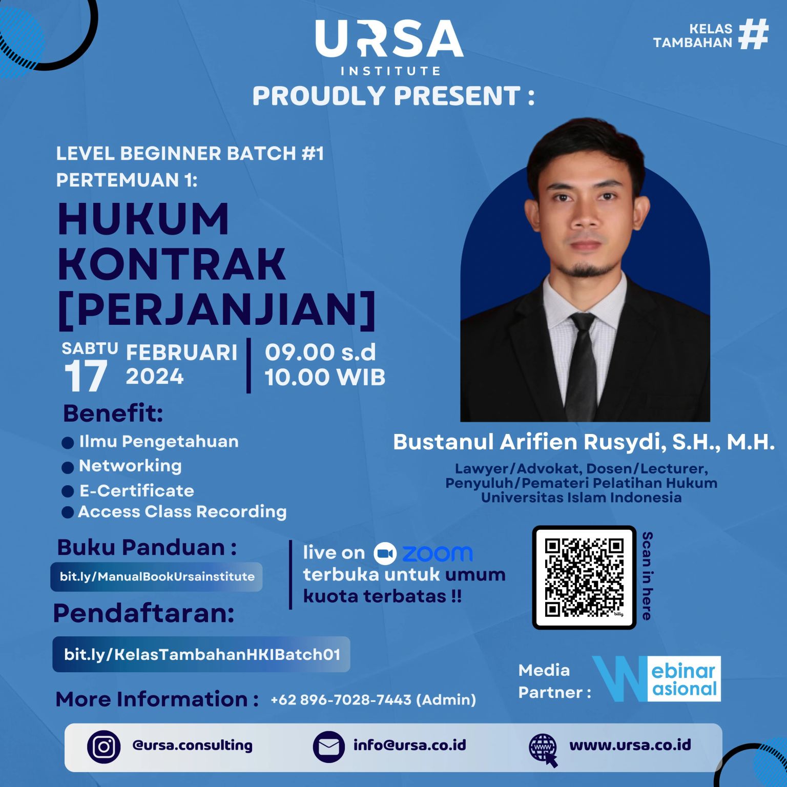 Kelas Tambahan hadir sebagai wadah pembelajaran secara daring yang bersifat dua arah yang membahas materi seputar ilmu hukum dengan menggunakan metode yang lebih fleksibel, karena peserta dapat belajar dan berdiskusi secara langsung dengan para pengajar yang ahli di bidangnya. Selain itu, terdapat juga latihan soal, kuis, dan ujian di setiap tingkatannya. Kelas ini akan dibawakan oleh pengajar yang berkompeten di bidangnya, yakni Bapak Bustanul Arifien Rusydi, S.H., M.H.